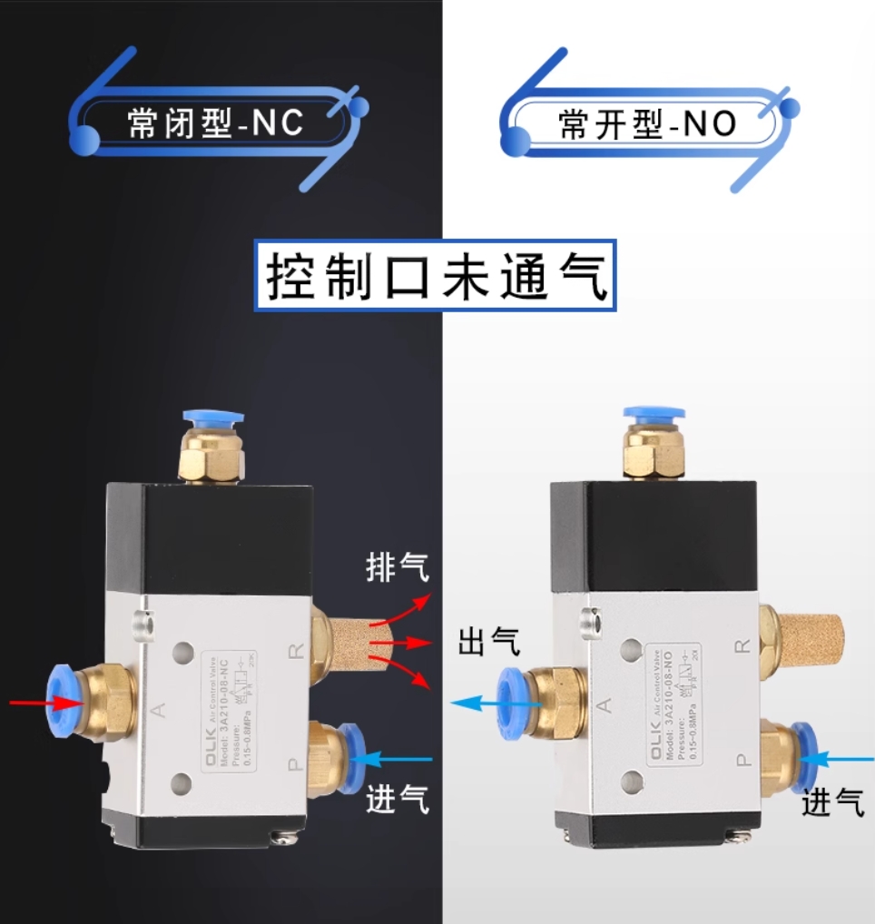 NC (normálně zavřený): ventil je zavřený, když není vzduch, a lze jej otevřít pouze po pohonu signálem/tlakem vzduchu.