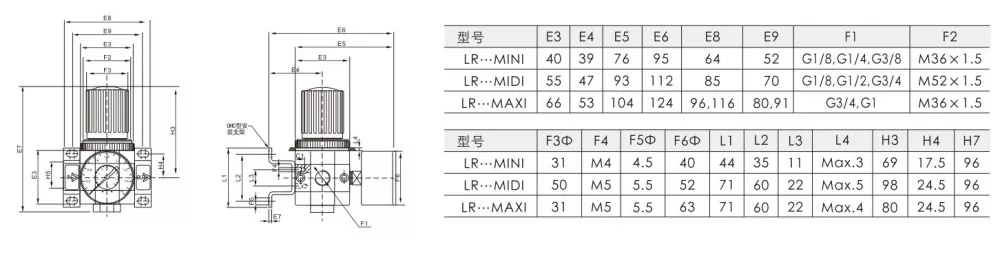 Mini/MIDI: Tlak typu bránice Regulatormaxi: Tlakový regulátor typu pístu