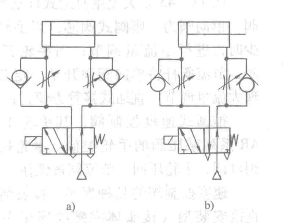 · V (a) (škrcení výfuku), když je směrový ventil pod napětím, otevře se zpětný ventil na vstupní straně válce, což umožňuje rychlé naplnění bezpístnicové strany. Vzduch na straně tyče může vycházet pouze přes škrticí ventil. Úpravou otevření škrticí klapky lze ovládat otáčky válce. Tato metoda zajišťuje stabilní pohyb pístu a je nejčastěji používaným obvodem.