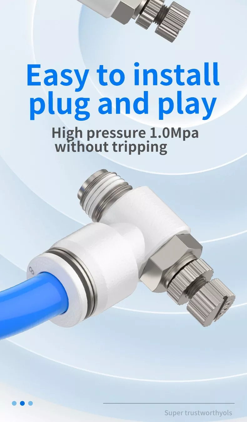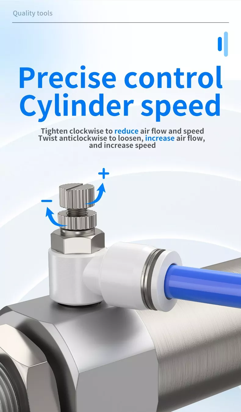 Regulátory rychlosti jsou běžné pneumatické komponenty používané k nastavení rychlosti vysouvání a zasouvání pohonů. Škrticí ventily jsou v podstatě komponenty nastavující průtok, které řídí otáčky válců, ale jejich montážní polohy, směry škrcení a konstrukce těla se liší. Podle způsobu ovládání je lze rozdělit na typ škrcení výfuku a typ škrcení sání.