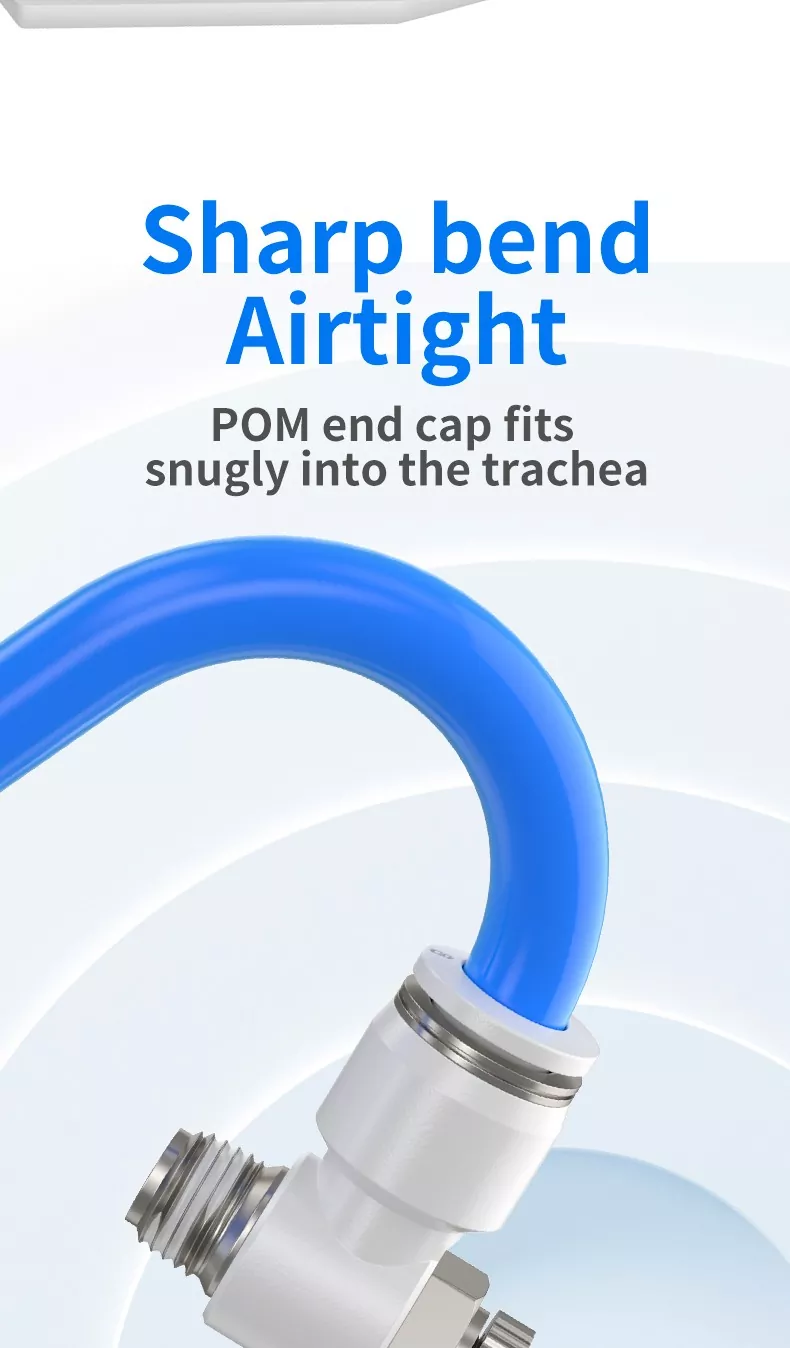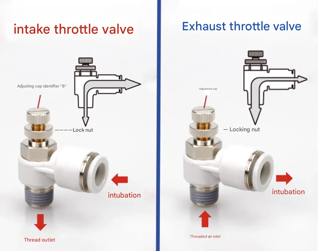 Vstupní škrticí ventily nasávají vzduch trubicí a výfuk přes závitový port; výfukové škrticí ventily nasávají vzduch přes závitový port a výfuk přes trubku.