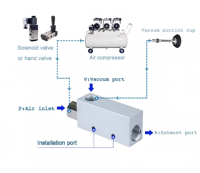 vakuové pumpy a vakuové generátory. Vakuová pumpa je mechanické zařízení, které vytváří podtlak na sacím otvoru a umožňuje výfukovému otvoru přímo procházet atmosférou s vysokým tlakovým poměrem na obou koncích pro extrakci plynu. Vakuový generátor je pneumatická součást, která využívá proud stlačeného vzduchu k vytvoření určitého stupně vakua. Ve srovnání s vakuovou pumpou má jednoduchou konstrukci, malý objem, nízkou hmotnost, nízkou cenu, pohodlnou instalaci, snadné složení s podpůrnými komponenty, rychlé vytváření a uvolňování vakua a je vhodné pro přerušovanou práci s nízkým průtokem, vhodné pro rozptýlené použití