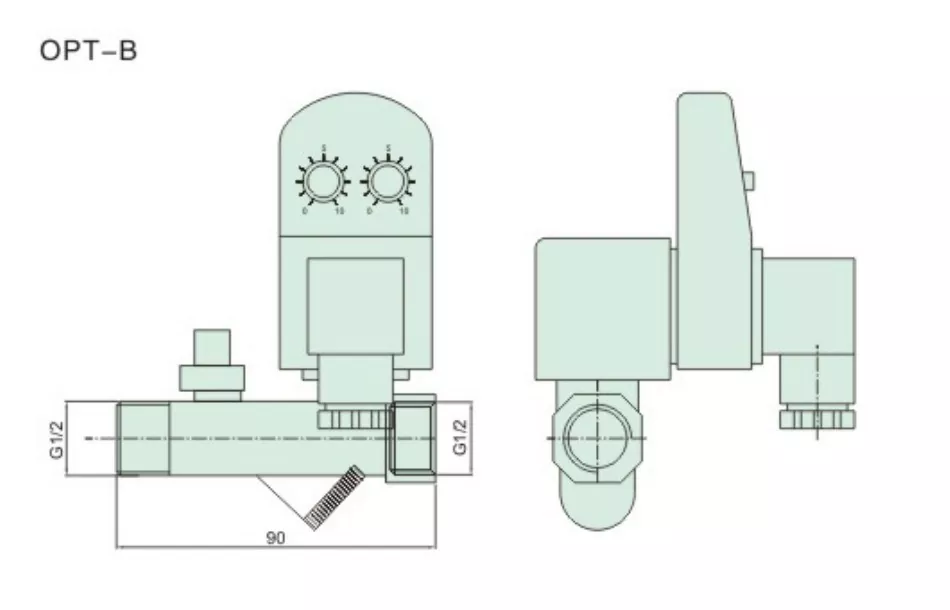 OLK OPT-B Elektronický časovač Auto Drain podporuje elektrické ovládání i manuální vypínání jako duální ochranu; na těle ventilu je vyhrazen externí ruční vypínací spínač, který zabraňuje průtoku při výpadku proudu. Vstup je umístěn na straně odvrácené od cívky, střední port bez závitů je odtokový výstup a konečný port je výstup.